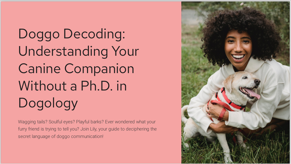 Wagging tails? Soulful eyes? Playful barks? Ever wondered what your furry friend is trying to tell you? Join Lily , your guide to deciphering the secret language of doggo communication!
